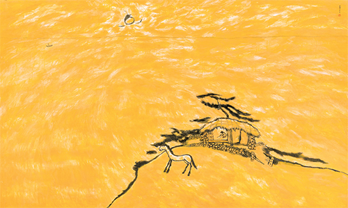 아침 해는 마치 작은 비행기가 방향을 틀 듯이 올라와 멈칫거린다. 바닷가엔 소나무 한 그루에 몸을 기댄 작은 집이 있고, 방 안엔 쪼그리고 앉은 사내가 그림을 그리고 있다. 세계를 보고 있는 것은 조랑말이며, 조랑말이 보고 있는 세계는 노랑으로 일렁이고, 화가는 그 앞에 없는 먹선으로 배 한 척을 이룬다.