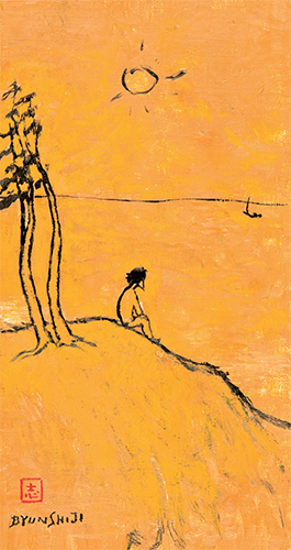 삶의 첫 번째 원칙은 기다림이라 할 수 있고, 많은 기다림으로 얼룩진 바다는 불망이 얼마나 하염없는가를 보여주기 위해 오늘도 물결 짓는 것이며, 기다림은 기다림 다음에도 기다림이라는 함축이다. 언뜻 그림은 기다림의 매혹에라도 빠진 듯 아름답다.