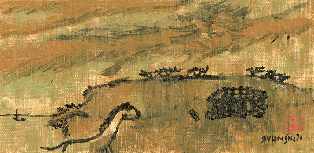 바람과 싸워온 키 낮은 나무들이 인상적인 언덕 위에 황갈색과 회녹색, 노랑, 하양들이 하나하나씩 순서대로 제주 풍경을 끌고 들어오는 것 같다. 어두운 대지에 선들은 젖으며 흐려지고, 조심스러운 사물들의 나신은 아직 자유롭다.