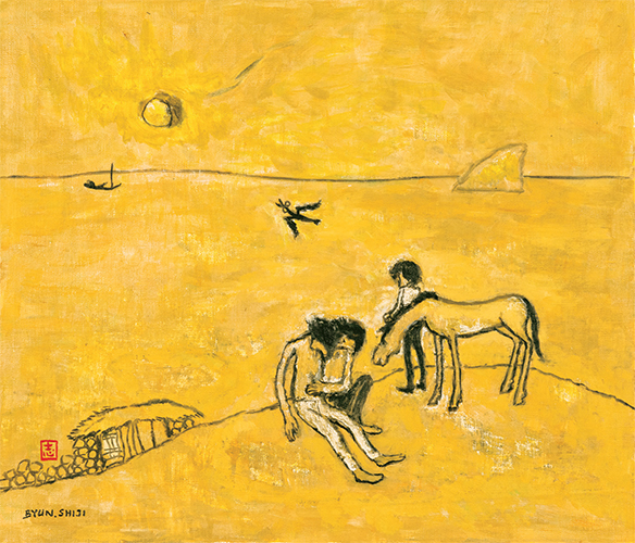 변시지 그림에 인물이 여럿 등장하는 일은 아주 드물다. 내가 알기에는 <바닷가의 추억>에 다섯 명이 있고, 이 <위로>에 세 명이 나오며 그 밖에 <자유 평화 사랑> <해녀> 등 몇 점의 그림에 복수의 인간이 있는 정도이다.